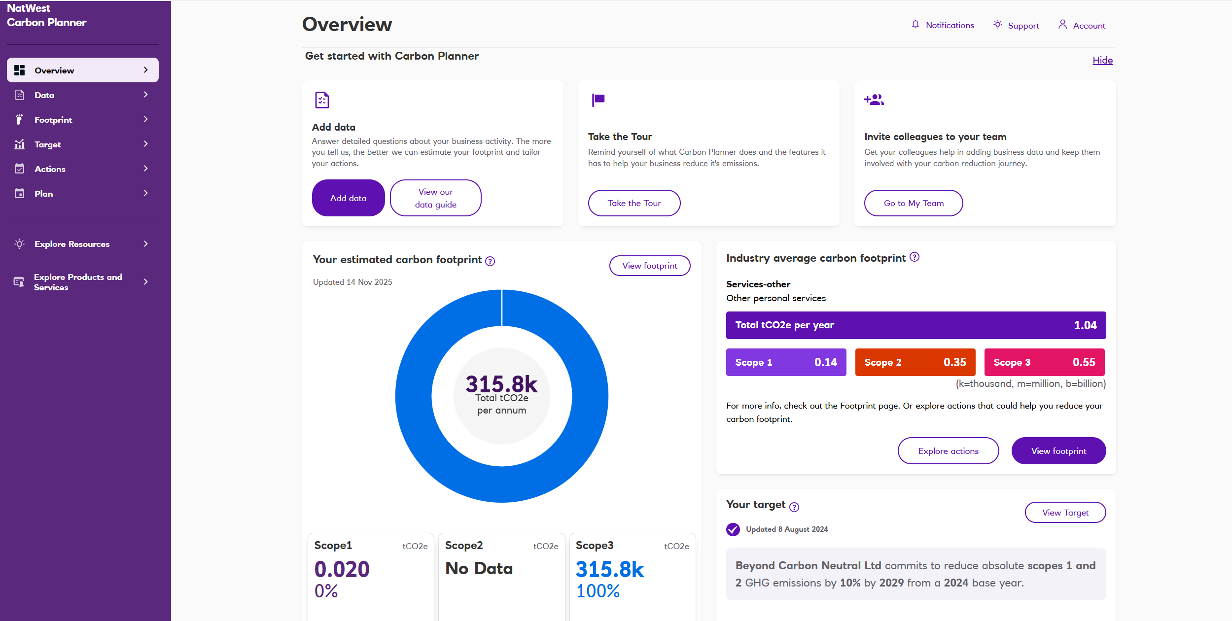 NatWest’s Carbon Planner is a digital tool aimed at its business banking customers, but usable by anyone. It helps SMEs understand their impact and identify potential cost and carbon savings.