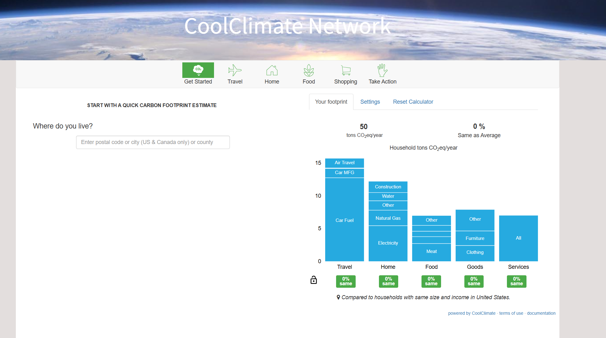 The CoolClimate Network (from UC Berkeley) provides a calculator that has been widely used as an educational tool. It focuses on activity data across energy, travel, and purchasing, and is particularly useful for understanding the drivers of your emissions profile.
