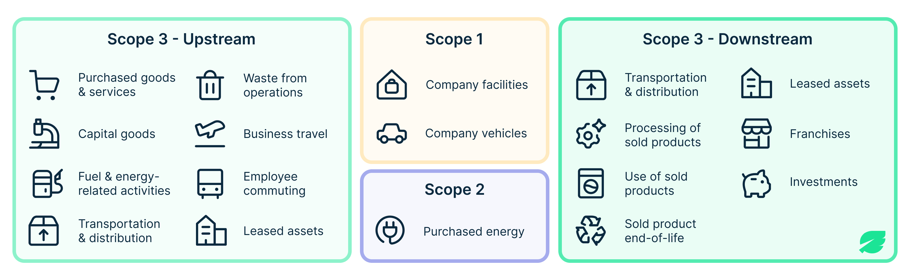 Carbon accounting groups emission sources into three ‘scopes’ so businesses can categorise what they’re responsible for in a consistent way. You can think of each scope as a bucket: Scope 1 covers direct emissions from assets you own or control, Scope 2 covers emissions from the energy you buy, and Scope 3 covers everything else up and down your value chain.